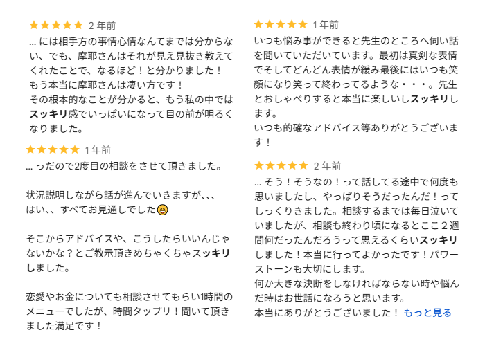聞いてもいない話を一方的にされて、納得ができないまま鑑定が終わったという話を多くの方からよく耳にします。しかし、私の鑑定は貴女のお話をしっかりと聞く事から始まります。 そして悩み事、辛いお気持ちをしっかりと受け止め、そこから質問内容に沿ったお話を納得のいくまでさせて頂きます。